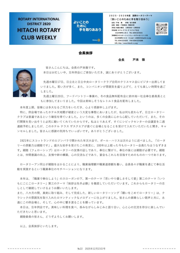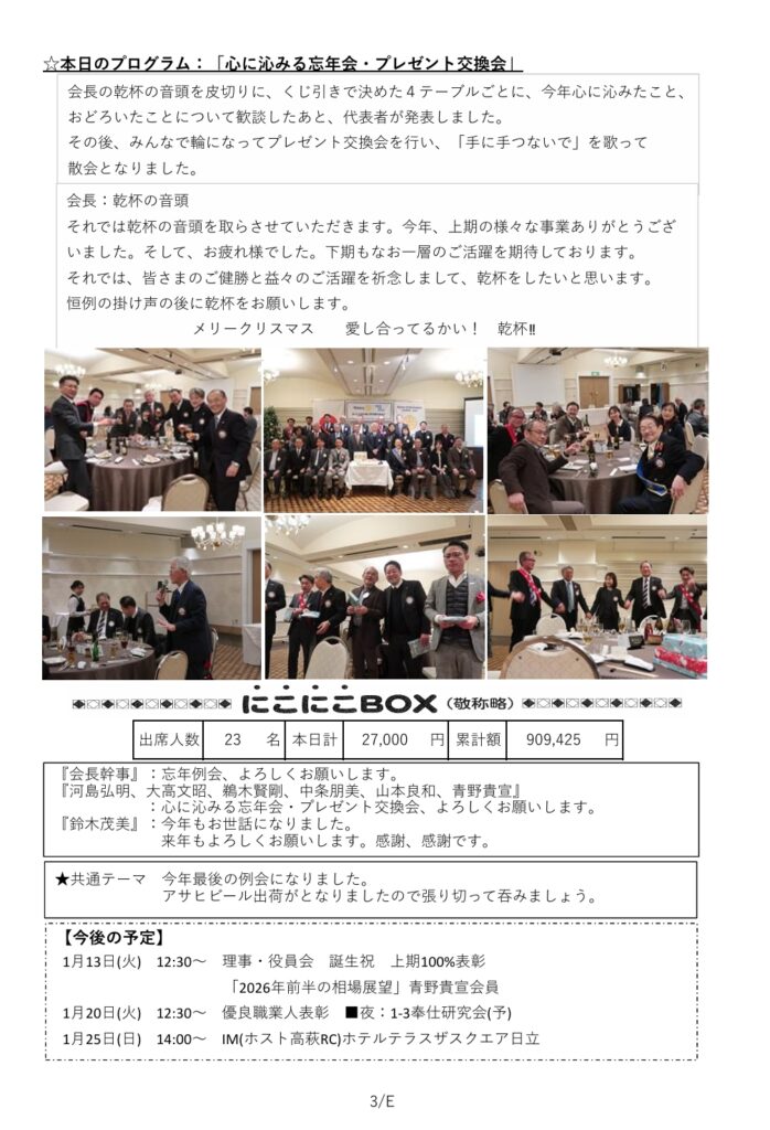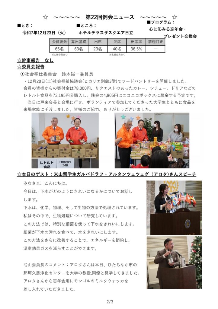 2025.12.23 忘年例会 心に沁みる忘年会 プレゼント交換会 2025 12/24 お知らせ お知らせ 2025.12.20 フードパントリー参加 2026.1.10 第20回 ひたち郷土かるた大会